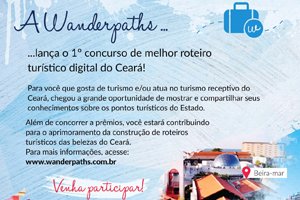 A Wanderpaths, start up da sócia Ne2me, lançou uma iniciativa inovadora: o 1º Concurso de Roteiro Turístico Digital do Ceará. A ação é voltada para profissionais e apaixonados pelo turismo. Para participar, basta acessar o site http://www.wanderpaths.com.br/, baixar o aplicativo – disponível para smartphones Android e iOS – e enviar o roteiro até 10/07/2017.