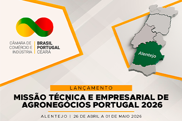 No próximo dia 13 de outubro, a Câmara Brasil Portugal no Ceará (CBPCE) realiza o lançamento oficial da Missão Técnica e Empresarial de Agronegócios Portugal 2026, em um encontro que promete reunir autoridades, empresários e representantes de instituições que fomentam o desenvolvimento econômico e comercial entre os dois países.